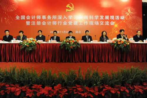 11月26日,財政部會計師事務(wù)所深入學習實踐科學發(fā)展觀活動指導小組、中國注冊會計師行業(yè)黨委在湖北省武漢市召開全國會計師事務(wù)所深入學習實踐科學發(fā)展觀活動暨注冊會計師行業(yè)黨建工作現(xiàn)場交流會,深入學習貫徹黨的十七屆四中全會精神,總結(jié)各省市區(qū)會計師事務(wù)所學習實踐活動和行業(yè)黨建工作做法,交流經(jīng)驗,探討方法,凝聚共識,更加扎實有效地推進會計師事務(wù)所學習實踐活動和行業(yè)黨建工作。財政部黨組成員、副部長、財政部會計師事務(wù)所深入學習實踐科學發(fā)展觀活動指導小組副組長、中國注冊會計師行業(yè)黨委書記王軍,湖北省委常委、常務(wù)副省長李憲生出席會議并講話。