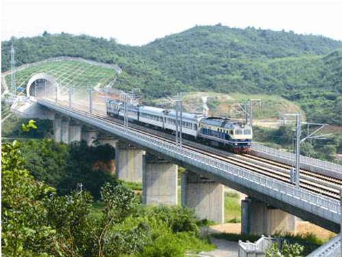 大瑤山位于湘粵交界之處,素有“南嶺險關(guān)”之稱。上世紀80年代,修建衡陽到廣州復線,建設(shè)者用7年時間在這里修建隧道,全長14公里,是當時國內(nèi)最長的雙線電氣化隧道。這次,武廣客專的方案是修建隧道群,由1號、2號、3號隧道組成,橋隧相連。3條隧道全長25公里,用了3年半全部竣工。
