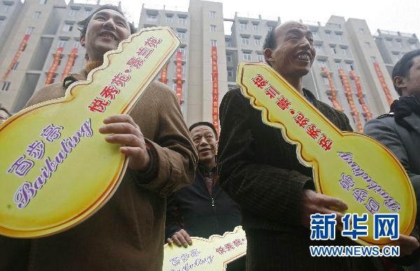 這是首批住戶代表在武漢市最大的保障性住房項(xiàng)目——百步亭社區(qū)悅秀苑、景蘭苑交房儀式上領(lǐng)到鑰匙(2009年12月8日攝)。 新華社發(fā)