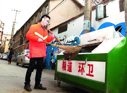 圖為:劉普林在幫母親掃大街(資料圖片)